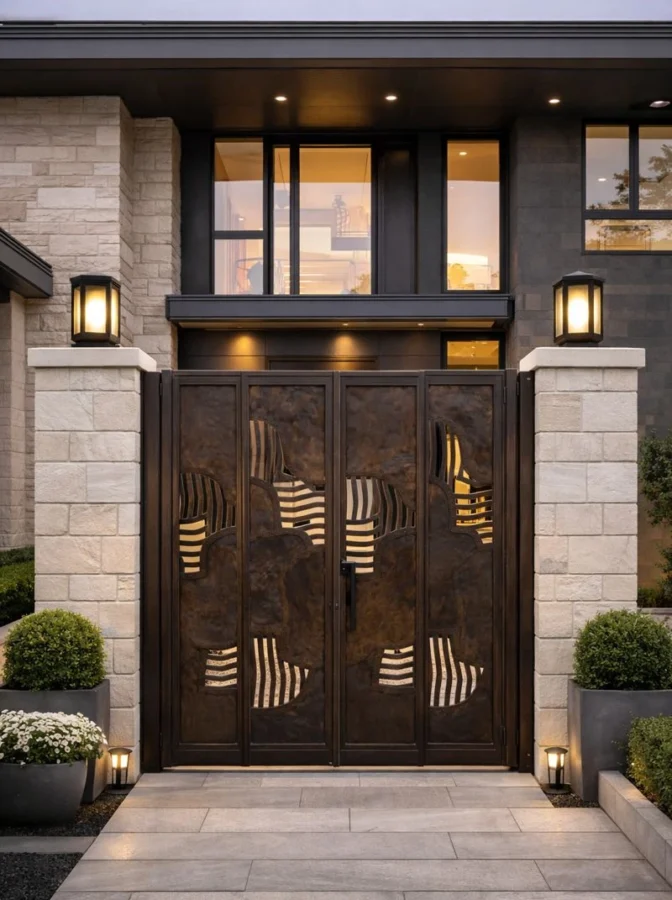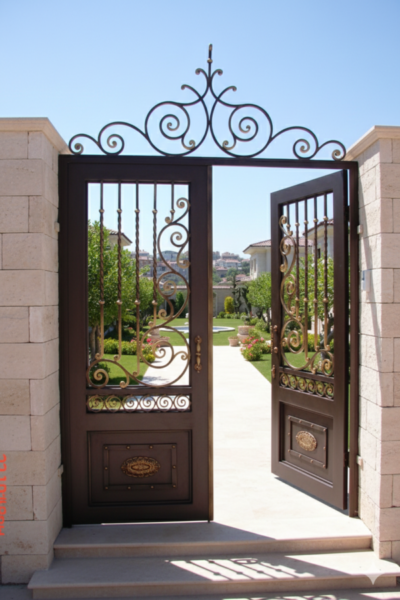 • Hibrit Tasarımlar: Demirin soğukluğunu kıran ahşap görünümlü demir bahçe kapısı veya cam kombinli estetik modeller.